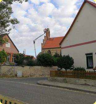 Eine Alternative bot die Firma GATENDA aus Niederndodeleben mit ihrer Technik an. Sie rückte den Baum mittels einer der Kettenarbeitsbühne zu Leibe. Auch wurden die schadhaften Fugen gleich noch mit ausgebessert.